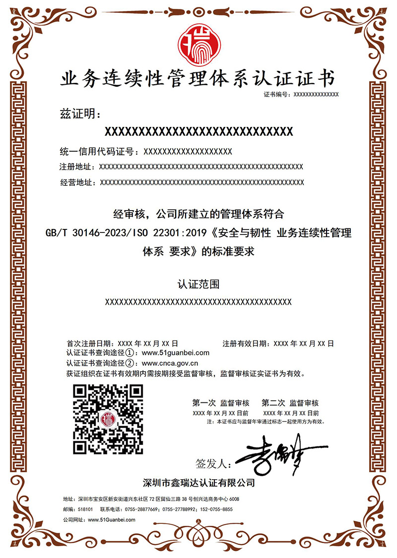 A004 业务连续性管理体系认证证书