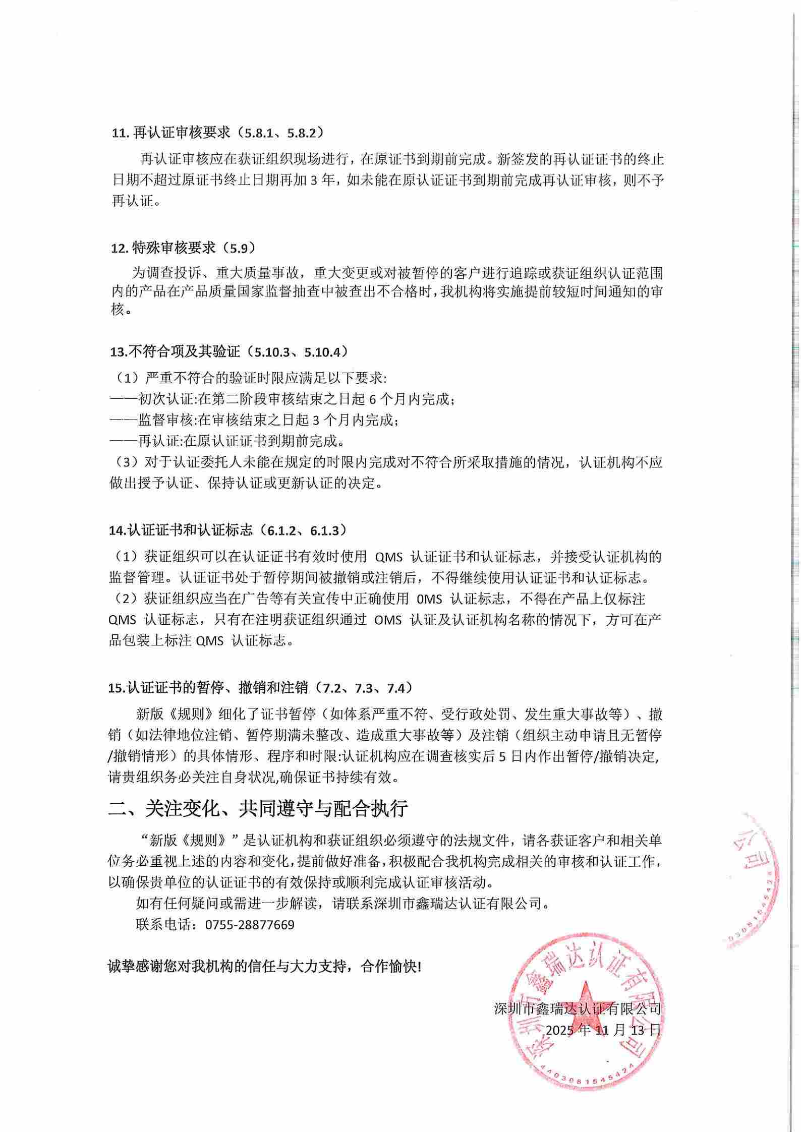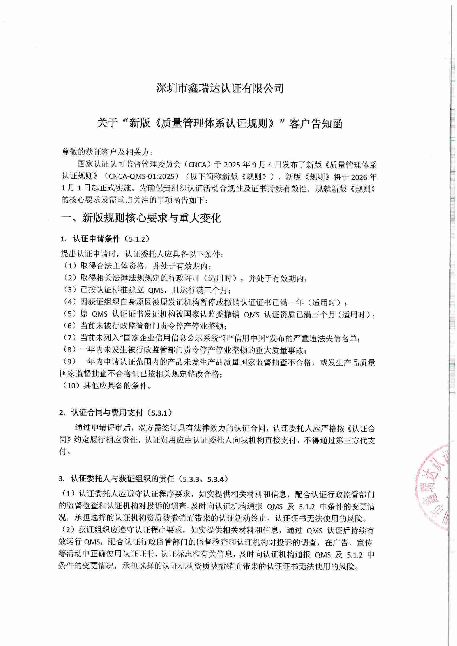 鑫瑞达认证关于《新版质量管理体系规则》客户告知函