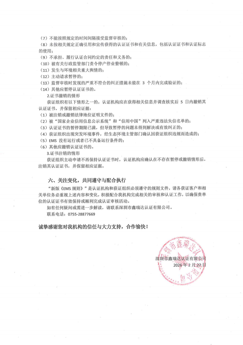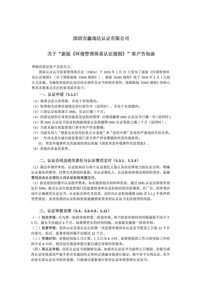 鑫瑞达关于《新版环境管理体系规则》客户告知函
